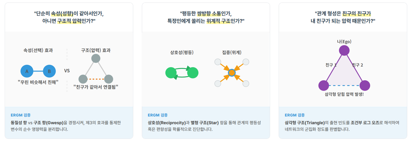 - 단순히 중심성 분석을 하거나 네트워크 시각화를 활용하여 네트워크를 설명하는 단계를 넘어, 네트워크가 ‘왜 이런 구조를 형성하는가?’를 통계적으로 증명하여 연구 설득력 제고