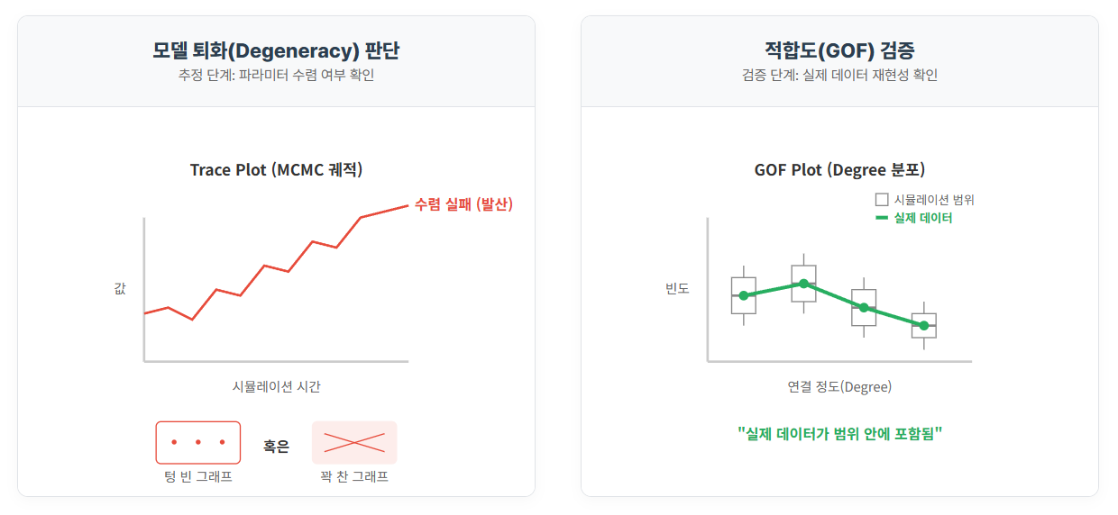 - 연구 질문에 맞춰 호혜성(Reciprocity), 동질성(Homophily), 이행성(Transitivity) 변수를 적절히 조합하고 MCMC 진단 및 적합도 검정(Goodness of Fit)을 통해 모델의 타당성을 평가하는 방법을 익힙니다.