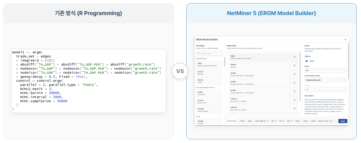 - 프로그래밍 언어를 몰라도 ERGM이라는 고급 방법론을 적용하는 연구 가능
