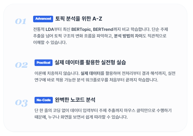 이 과정에서는 코딩 없이 텍스트에서 숨겨진 주제 구조를 분석하고 변화 흐름을 파악하는 방법을 익힐 수 있습니다.