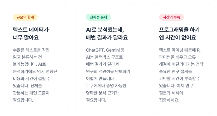 인터뷰, 설문 서술형 응답 등 질적 데이터를 체계적으로 분석하고 싶은 연구자